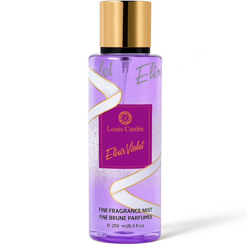 Elixir Violet  Body Mist  Opens with Fresh Fruity Top Notes of Pear Leaves Giving Way to Middle Notes of Jasmine, Rose and lands on the Base Notes of Vanilla, Amber